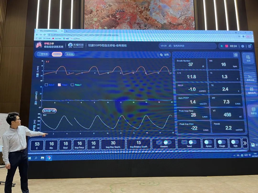 此外,来自中国科学技术大学附属第一医院(安徽省立医院)的金魁主任在讲授主旨为“异常波形分析”的论坛讲座时,使用了华体平台-华体(中国)“模拟肺”内置的呼吸力学模型——“轻度COPD有自主呼吸 老年男性”,帮助参会学员更好的理解存在肺部疾病患者机械通气时通气波形的特点及监测参数异常改变。金魁主任对“模拟肺”给予了高度肯定,并建议学员课后有时间都可以进行实操训练。